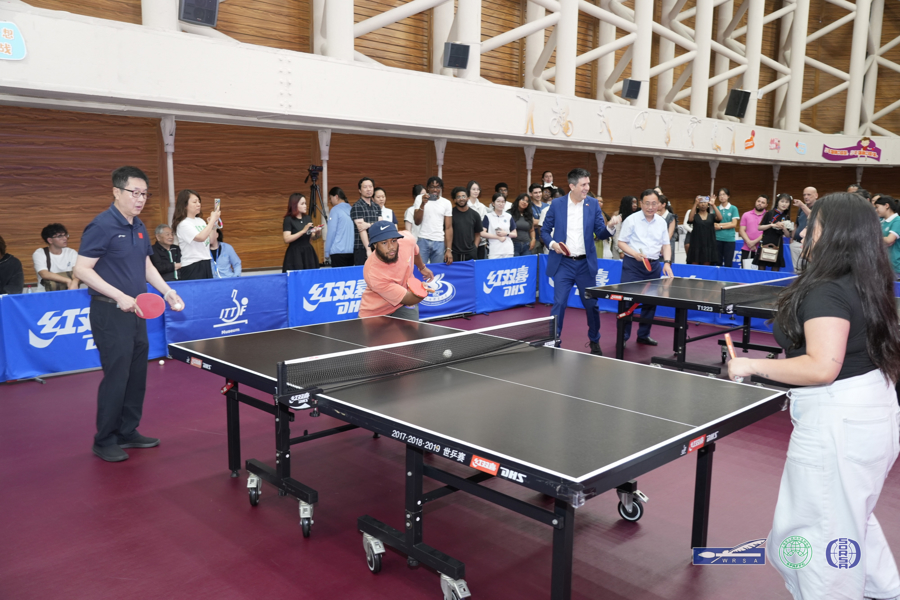 国际乒联博物馆、中国乒乓球博物馆馆长施之皓 ,乒乓球奥运冠军阎森分别搭档美国肯恩大学学生代表