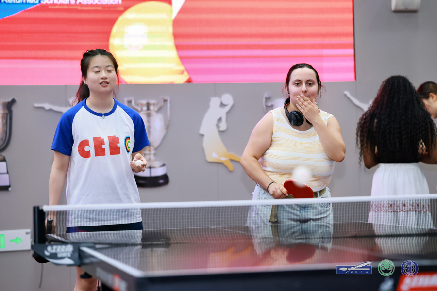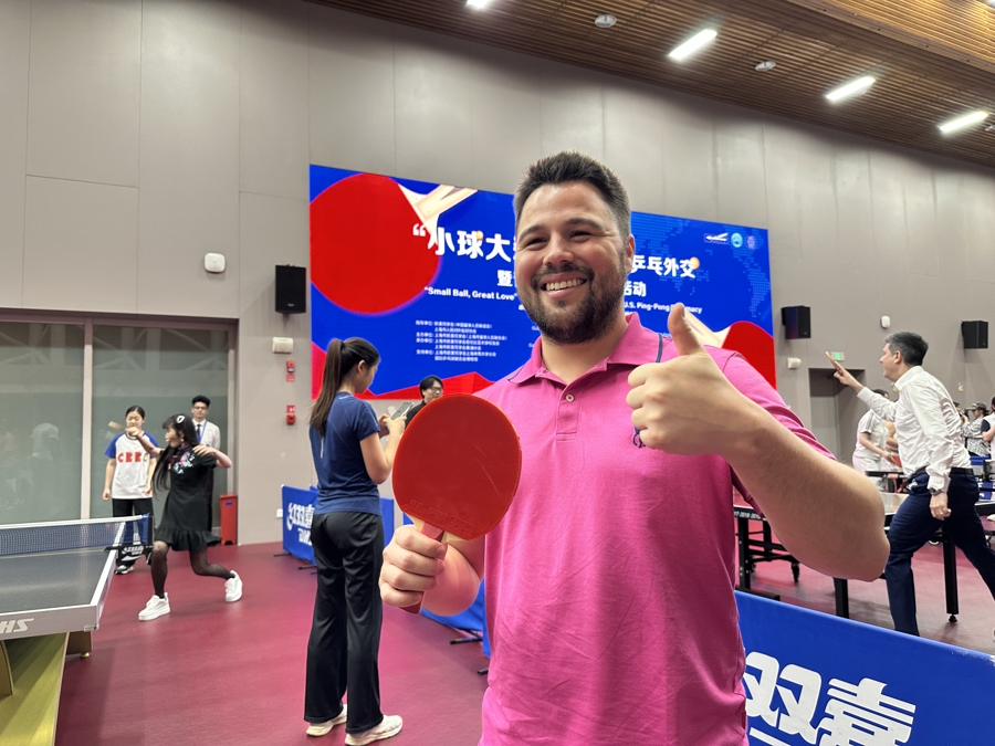 从小在地下室跟着爸爸一起学打乒乓球的雷蒙,和温州肯恩大学执行副校长安凯瑞(Cary Anderson)、美国弗吉尼亚大学驻中国代表处首席代表欧君廷(Justin O'Jack)一起,与同学们挥拍对战。他还带来了自己的球拍。“我想,我来到中国,或许有部分原因就是受到乒乓外交精神的影响,那就是跨越国界的可能性、结识新朋友、以新的方式发现自己。这些也是大学精神的一部分。”雷蒙说。“‘乒乓外交’是打破隔阂的全球关系催化剂”,安凯瑞说,作为国际教育合作的成果,温州肯恩大学将持续培养“尊重多样性的世界公民”,传承“乒乓外交”精神。