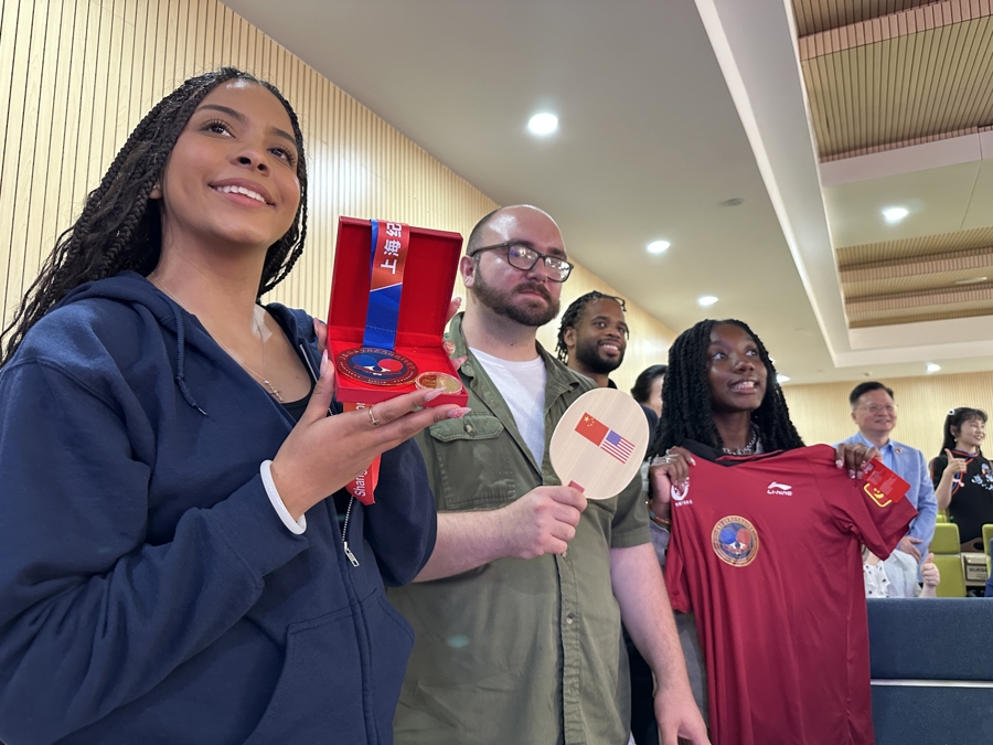 活动现场,中美双方学生代表互赠纪念品,完成跨越太平洋的友谊接力。美方学生向中方赠送印有美国肯恩大学标识的定制T恤,寓意“学术纽带共织未来”;中方学生回赠特制乒乓球拍、球衣及“小球大爱”纪念币,纪念币刻有七宝珐琅熊猫与背面旋转球轨,分别致敬 1971年乒乓破冰与1972年熊猫外交的两大外交里程碑。中方学生代表陈嘉晟感叹,“当我把球拍交到美国朋友手中,突然懂了周总理说的‘小球转动了地球’。这件T恤承载着历史的重量和时代的使命。我们这一代人肩负着推动世界向前发展的重任”。
